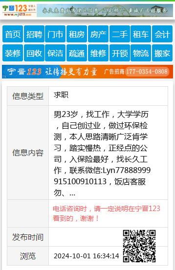 男23岁,找工作,大学学历,自己创过业,做过环保检测,本人思路清晰广泛肯学习,踏实慢热,正经点的公司,入保险最好,找长久工作,联系微信:Lyn77888999915100910113,饭店客服勿、 【电话咨询时,请一定说明在宁晋123看到的,谢谢!】 |