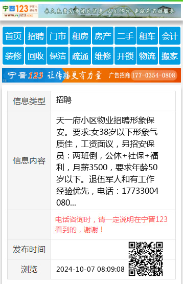 天一府小区物业招聘形象保安。要求:女38岁以下形象气质佳,工资面议,另招安保员:两班倒,公休+社保+福利,月薪3500,要求年龄50岁以下。退伍军人和有工作经验优先,电话:17733004080