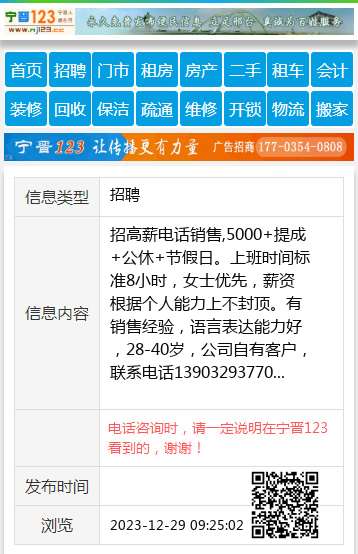 招高薪电话销售,5000+提成+公休+节假日。上班时间标准8小时,女士优先,薪资根据个人能力上不封顶。有销售经验,语言表达能力好,28-40岁,公司自有客户,联系电话13903293770 【电话咨询时,请一定说明在宁晋123看到的,谢谢!】 |
