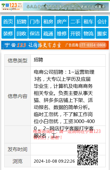 电商公司招聘:1~运营助理3名,大专以上学历及应届毕业生,计算机及电商商务相关专业。负责主要从事天猫、拼多多店铺上下架、活动报名、数据的简单分析。临时工勿扰,不了解工作岗位小白勿扰,工资3000-4000 。2~网店打字客服打字客服2名,工作3500+有半年以上工作经验。电话15833729191 宁晋县恒基现代城 【电话咨询时,请一定说明在宁晋123看到的,谢谢!】 |