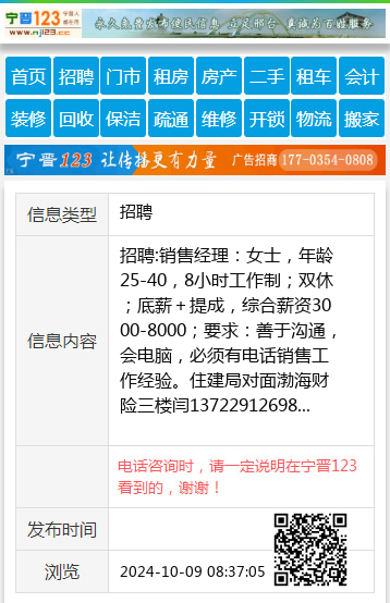 招聘:销售经理:女士,年龄25-40,8小时工作制;双休;底薪+提成,综合薪资3000-8000;要求:善于沟通,会电脑,必须有电话销售工作经验。住建局对面渤海财险三楼闫13722912698 【电话咨询时,请一定说明在宁晋123看到的,谢谢!】 |