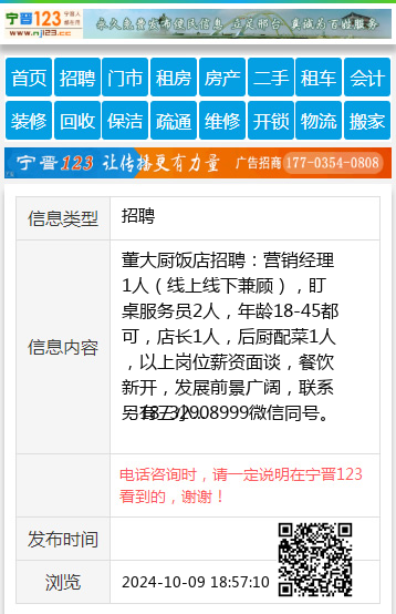董大厨饭店招聘:营销经理1人(线上线下兼顾),盯桌服务员2人,年龄18-45都可,店长1人,后厨配菜1人,以上岗位薪资面谈,餐饮新开,发展前景广阔,联系:18732908999微信同号。
