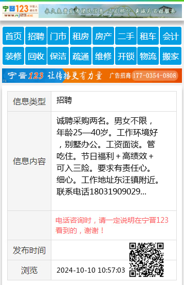 诚聘采购两名。男女不限,年龄25—40岁。工作环境好,别墅办公。工资面谈。管吃住。节日福利+高绩效+可入三险。要求有责任心。细心。工作地址东汪镇附近。联系电话18031909029 【电话咨询时,请一定说明在宁晋123看到的,谢谢!】 |