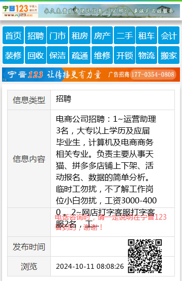 电商公司招聘:1~运营助理3名,大专以上学历及应届毕业生,计算机及电商商务相关专业。负责主要从事天猫、拼多多店铺上下架、活动报名、数据的简单分析。临时工勿扰,不了解工作岗位小白勿扰,工资3000-4000 。2~网店打字客服打字客服2名,工作3500+有半年以上工作经验。电话15833729191 宁晋县恒基现代城 【电话咨询时,请一定说明在宁晋123看到的,谢谢!】 |