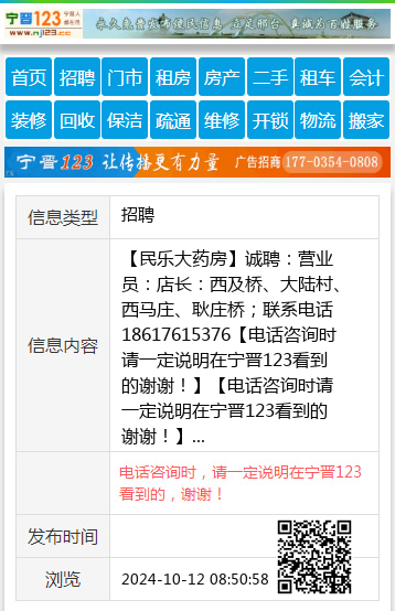 【民乐大药房】诚聘:营业员:店长:西及桥、大陆村、西马庄、耿庄桥;联系电话18617615376【电话咨询时请一定说明在宁晋123看到的谢谢!】【电话咨询时请一定说明在宁晋123看到的谢谢!】 【电话咨询时,请一定说明在宁晋123看到的,谢谢!】 |