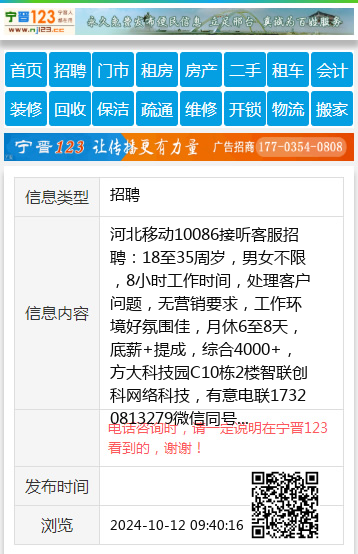 河北移动10086接听客服招聘:18至35周岁,男女不限,8小时工作时间,处理客户问题,无营销要求,工作环境好氛围佳,月休6至8天,底薪+提成,综合4000+,方大科技园C10栋2楼智联创科网络科技,有意电联17320813279微信同号