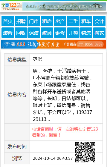 男,36岁,干活踏实肯干,C本驾照车辆都能熟练驾驶,东菜市场跟童泰居住,找各种各样开车送货或者其他活等等,长期,日结都可以,随时上班,微信同号,销售勿扰,不会可以学,13933729113 【电话咨询时,请一定说明在宁晋123看到的,谢谢!】 |