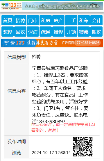 宁晋县城南环路食品厂诚聘:1、维修工2名,要求踏实细心,有五年以上工作经验;2、车间工人数名,要求吃苦耐劳,有在食品厂工作经验的优先录用,活很好学;3、门卫1名,管吃住,要求负责任,反应快。联系电话18333980897 【电话咨询时,请一定说明在宁晋123看到的,谢谢!】 |