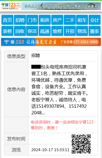 ███包头电缆库房招司机兼普工1名,熟练工优先录用,环境优越,待遇优厚,免费食宿,设备齐全。工作认真诚实,吃苦耐劳,踏实肯干。老板宁晋人,诚信待人,电话15149307894、15174922048 【电话咨询时,请一定说明在宁晋123看到的,谢谢!】 |