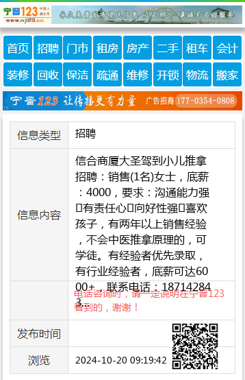 信合商厦大圣驾到小儿推拿招聘:销售(1名)女士,底薪:4000,要求:沟通能力强➕有责任心➕向好性强➕喜欢孩子,有两年以上销售经验,不会中医推拿原理的,可学徒。有经验者优先录取,有行业经验者,底薪可达6000+,联系电话:18714284394(微信同号) 【电话咨询时,请一定说明在宁晋123看到的,谢谢!】 |