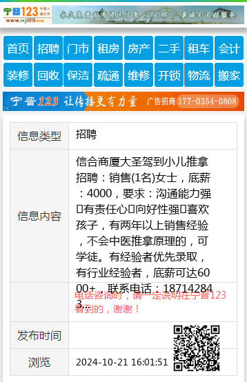 信合商厦大圣驾到小儿推拿招聘:销售(1名)女士,底薪:4000,要求:沟通能力强➕有责任心➕向好性强➕喜欢孩子,有两年以上销售经验,不会中医推拿原理的,可学徒。有经验者优先录取,有行业经验者,底薪可达6000+,联系电话:18714284394(微信同号) 【电话咨询时,请一定说明在宁晋123看到的,谢谢!】 |