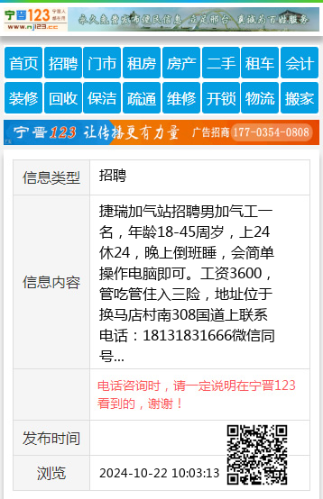 捷瑞加气站招聘男加气工一名,年龄18-45周岁,上24休24,晚上倒班睡,会简单操作电脑即可。工资3600,管吃管住入三险,地址位于换马店村南308国道上联系电话:18131831666微信同号 【电话咨询时,请一定说明在宁晋123看到的,谢谢!】 |