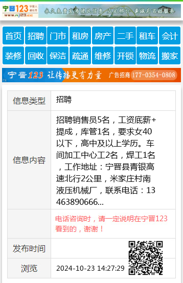 招聘销售员5名,工资底薪+提成,库管1名,要求女40以下,高中及以上学历。车间加工中心工2名,焊工1名,工作地址:宁晋县青银高速北行2公里,米家庄村南液压机械厂,联系电话:13463890666 【电话咨询时,请一定说明在宁晋123看到的,谢谢!】 |