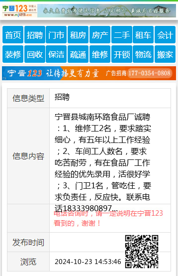 宁晋县城南环路食品厂诚聘:1、维修工2名,要求踏实细心,有五年以上工作经验;2、车间工人数名,要求吃苦耐劳,有在食品厂工作经验的优先录用,活很好学;3、门卫1名,管吃住,要求负责任,反应快。联系电话18333980897 【电话咨询时,请一定说明在宁晋123看到的,谢谢!】 |