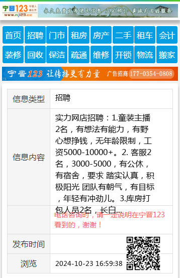实力网店招聘:1.童装主播 2名,有想法有能力,有野心想挣钱,无年龄限制,工资5000-10000+。2. 客服2名,3000-5000,有公休,有宿舍,要求 踏实认真,积极阳光 团队有朝气,有目标,年轻有冲劲儿。3.库房打包人员2名,长白班,库房有空调,有工作经验者优先录用。地址:东亚 菜市场 大医院附近 县城 ,联系电话15533197597 【电话咨询时,请一定说明在宁晋123看到的,谢谢!】 |