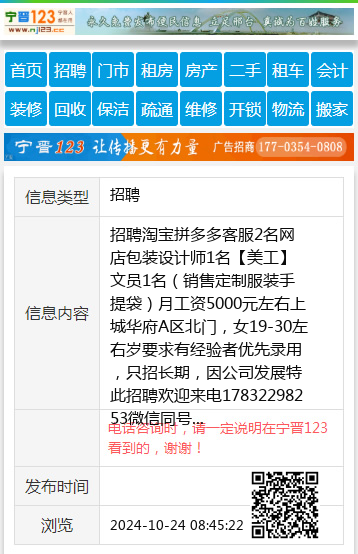 招聘淘宝拼多多客服2名网店包装设计师1名【美工】文员1名(销售定制服装手提袋)月工资5000元左右上城华府A区北门,女19-30左右岁要求有经验者优先录用,只招长期,因公司发展特此招聘欢迎来电17832298253微信同号 【电话咨询时,请一定说明在宁晋123看到的,谢谢!】 |