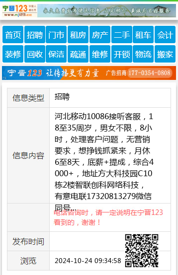 河北移动10086接听客服,18至35周岁,男女不限,8小时,处理客户问题,无营销要求,想挣钱抓紧来,月休6至8天,底薪+提成,综合4000+,地址方大科技园C10栋2楼智联创科网络科技,有意电联17320813279微信同号 【电话咨询时,请一定说明在宁晋123看到的,谢谢!】 |