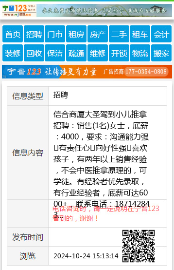 信合商厦大圣驾到小儿推拿招聘:销售(1名)女士,底薪:4000,要求:沟通能力强➕有责任心➕向好性强➕喜欢孩子,有两年以上销售经验,不会中医推拿原理的,可学徒。有经验者优先录取,有行业经验者,底薪可达6000+,联系电话:18714284394(微信同号)