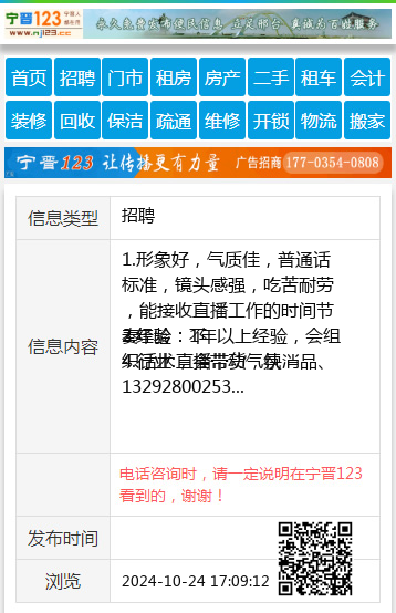 4.行业:直播带货,快消品、13292800253 【电话咨询时,请一定说明在宁晋123看到的,谢谢!】 |