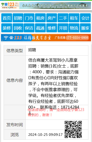 信合商厦大圣驾到小儿推拿招聘:销售(1名)女士,底薪:4000,要求:沟通能力强➕有责任心➕向好性强➕喜欢孩子,有两年以上销售经验,不会中医推拿原理的,可学徒。有经验者优先录取,有行业经验者,底薪可达6000+,联系电话:18714284394(微信同号) 【电话咨询时,请一定说明在宁晋123看到的,谢谢!】 |