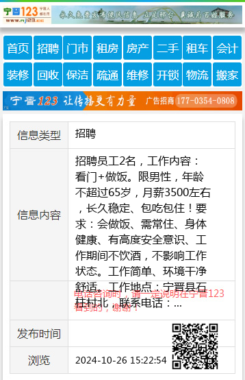 招聘员工2名,工作内容:看门+做饭。限男性,年龄不超过65岁,月薪3500左右,长久稳定、包吃包住!要求:会做饭、需常住、身体健康、有高度安全意识、工作期间不饮酒,不影响工作状态。工作简单、环境干净舒适。工作地点:宁晋县石柱村北,联系电话:13933737991 【电话咨询时,请一定说明在宁晋123看到的,谢谢!】 |