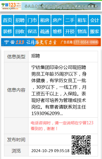 宁纺集团印染分公司现招聘男员工年龄35周岁以下,身体健康,有学历女员工一批,30岁以下,一线工作,月工资五千以上,入保险。表现好者可培养为管理或技术岗位。有意者请联系刘主任15930962099