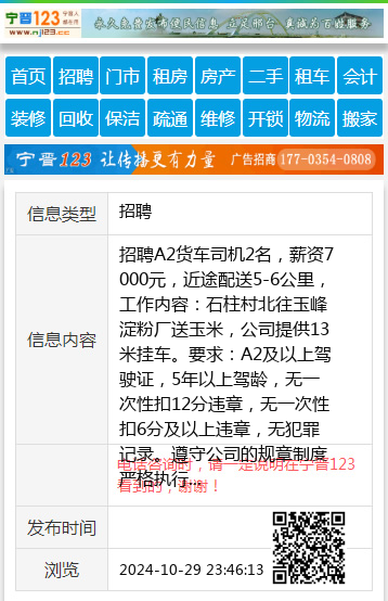 招聘A2货车司机2名,薪资7000元,近途配送5-6公里,工作内容:石柱村北往玉峰淀粉厂送玉米,公司提供13米挂车。要求:A2及以上驾驶证,5年以上驾龄,无一次性扣12分违章,无一次性扣6分及以上违章,无犯罪记录。遵守公司的规章制度严格执行驾驶规则。联系13933737991 【电话咨询时,请一定说明在宁晋123看到的,谢谢!】 |