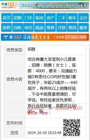 信合商厦大圣驾到小儿推拿,招聘:销售(女士),底薪:4000,要求:沟通能力强➕有责任心➕向好性强➕喜欢孩子,年龄25周岁—-440周岁,有两年以上销售经验,不会中医推拿原理的,可学徒。有经验者优先录取,有行业经验者,底薪可达6000+。联系电话:18714284394(微信同号) 【电话咨询时,请一定说明在宁晋123看到的,谢谢!】 |
