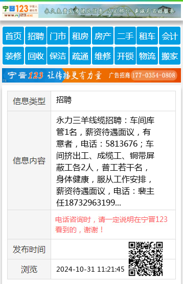 永力三羊线缆招聘:车间库管1名,薪资待遇面议,有意者,电话:5813676;车间挤出工、成缆工、铜带屏蔽工各2人,普工若干名,身体健康,服从工作安排,薪资待遇面议,电话:裴主任18732963199 【电话咨询时,请一定说明在宁晋123看到的,谢谢!】 |