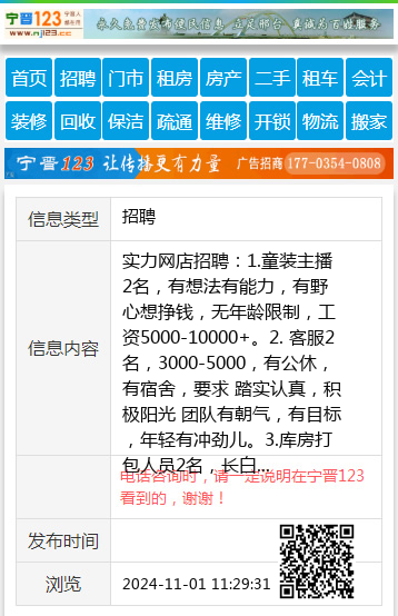 实力网店招聘:1.童装主播 2名,有想法有能力,有野心想挣钱,无年龄限制,工资5000-10000+。2. 客服2名,3000-5000,有公休,有宿舍,要求 踏实认真,积极阳光 团队有朝气,有目标,年轻有冲劲儿。3.库房打包人员2名,长白班,库房有空调,有工作经验者优先录用。地址:东亚 菜市场 大医院附近 县城 ,联系电话15533197597 【电话咨询时,请一定说明在宁晋123看到的,谢谢!】 |