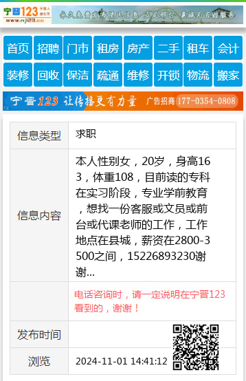 本人性别女,20岁,身高163,体重108,目前读的专科在实习阶段,专业学前教育,想找一份客服或文员或前台或代课老师的工作,工作地点在县城,薪资在2800-3500之间,15226893230谢谢 【电话咨询时,请一定说明在宁晋123看到的,谢谢!】 |