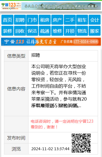 本公司明天将举办大型创业说明会,若您正在寻找一份零投资,轻创业,无风险,工作时间自由的平台,不妨来考察一下。并有亲情沟通苹果采摘活动,参与就有20斤苹果赠送,报名从速。