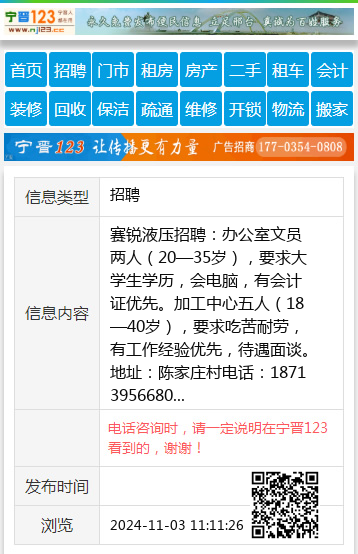 赛锐液压招聘:办公室文员两人(20—35岁),要求大学生学历,会电脑,有会计证优先。加工中心五人(18—40岁),要求吃苦耐劳,有工作经验优先,待遇面谈。地址:陈家庄村电话:18713956680 【电话咨询时,请一定说明在宁晋123看到的,谢谢!】 |