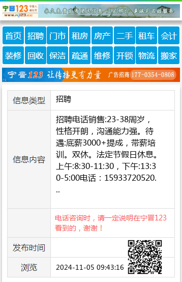 招聘电话销售:23-38周岁,性格开朗,沟通能力强。待遇:底薪3000+提成,带薪培训。双休。法定节假日休息。上午:8:30-11:30,下午:13:30-5:00电话:15933720520 【电话咨询时,请一定说明在宁晋123看到的,谢谢!】 |