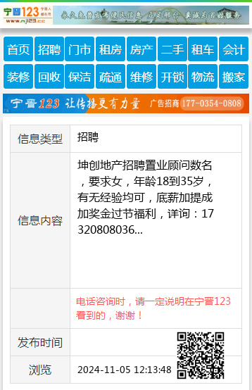 坤创地产招聘置业顾问数名,要求女,年龄18到35岁,有无经验均可,底薪加提成加奖金过节福利,详询:17320808036