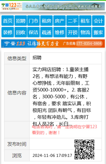 实力网店招聘:1.童装主播 2名,有想法有能力,有野心想挣钱,无年龄限制,工资5000-10000+。2. 客服2名,3000-5000,有公休,有宿舍,要求 踏实认真,积极阳光 团队有朝气,有目标,年轻有冲劲儿。3.库房打包人员2名,长白班,库房有空调,有工作经验者优先录用。地址:东亚 菜市场 大医院附近 县城 ,联系电话15533197597 【电话咨询时,请一定说明在宁晋123看到的,谢谢!】 |