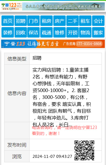 实力网店招聘:1.童装主播 2名,有想法有能力,有野心想挣钱,无年龄限制,工资5000-10000+。2. 客服2名,3000-5000,有公休,有宿舍,要求 踏实认真,积极阳光 团队有朝气,有目标,年轻有冲劲儿。3.库房打包人员2名,长白班,库房有空调,有工作经验者优先录用。地址:东亚 菜市场 大医院附近 县城 ,联系电话15533197597 【电话咨询时,请一定说明在宁晋123看到的,谢谢!】 |