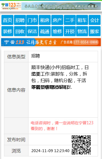 顺丰快递(小件)招临时工,日结工, 主要工作:装卸车,分拣,拆包,扫码,随机分配,干活不累,容易上手! 年龄要求18-55周岁 详情19041996761