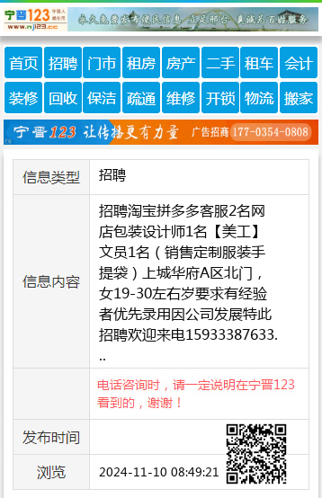 招聘淘宝拼多多客服2名网店包装设计师1名【美工】文员1名(销售定制服装手提袋)上城华府A区北门,女19-30左右岁要求有经验者优先录用因公司发展特此招聘欢迎来电15933387633 【电话咨询时,请一定说明在宁晋123看到的,谢谢!】 |