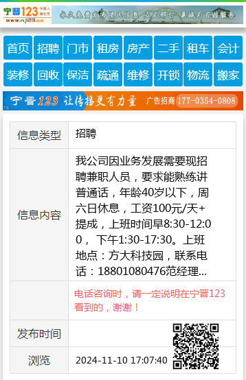 我公司因业务发展需要现招聘兼职人员,要求能熟练讲普通话,年龄40岁以下,周六日休息,工资100元/天+提成,上班时间早8:30-12:00, 下午1:30-17:30。上班地点:方大科技园,联系电话:18801080476范经理 【电话咨询时,请一定说明在宁晋123看到的,谢谢!】 |