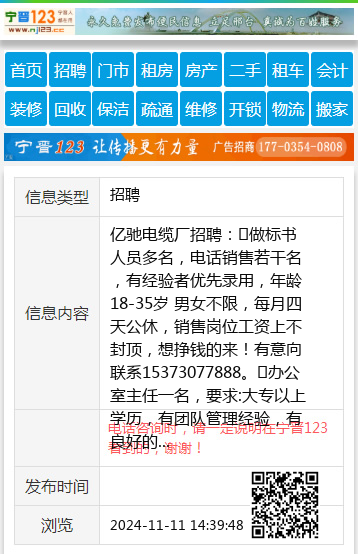 亿驰电缆厂招聘:❶做标书人员多名,电话销售若干名,有经验者优先录用,年龄18-35岁 男女不限,每月四天公休,销售岗位工资上不封顶,想挣钱的来!有意向联系15373077888。❷办公室主任一名,要求:大专以上学历,有团队管理经验,有良好的团队领导能力,男女不限。❸办公室文员两名,大专以上学历,应变能力强,工作认真负责,服从公司安排。❹质检员两名,大专以上学历,聪明伶俐,工作认真负责,吃苦耐劳。❺门岗一名,勤劳健康,六十岁以内。❻厨师一名,勤劳健康,能做简单的菜品。❼电工维修工一名。❽统计一名。
