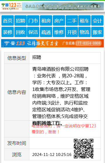 青岛啤酒股份有限公司招聘:业务代表 ,男20-28周,学历:大专及以上。工作:1收集市场信息;2开发、管理经销商网络,维护定格区域内终端;3设计、执行和监控定格区域促销活动;4维护、管理价格体系;5完成领导交办的其他工作。