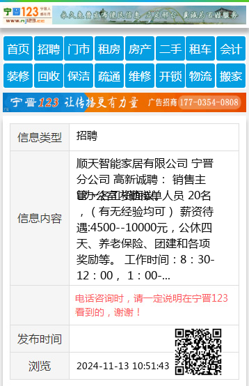 顺天智能家居有限公司 宁晋分公司 高新诚聘: 销售主管一名工资面议。