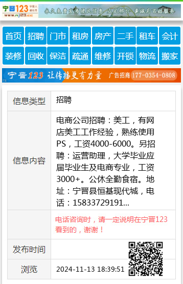 电商公司招聘:美工,有网店美工工作经验,熟练使用PS,工资4000-6000。另招聘:运营助理,大学毕业应届毕业生及电商专业,工资3000+。公休全勤食宿。地址:宁晋县恒基现代城,电话:15833729191 【电话咨询时,请一定说明在宁晋123看到的,谢谢!】 |