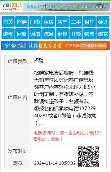 招聘家电售后客服,纯接线无销售性质登记客户信息反馈客户内容轻松无压力8.5小时倒班制,有夜班补贴,不耽误接送孩子,名额有限,想报名的抓紧喽电话13722940281或者➕微信(非诚勿扰) 【电话咨询时,请一定说明在宁晋123看到的,谢谢!】 |