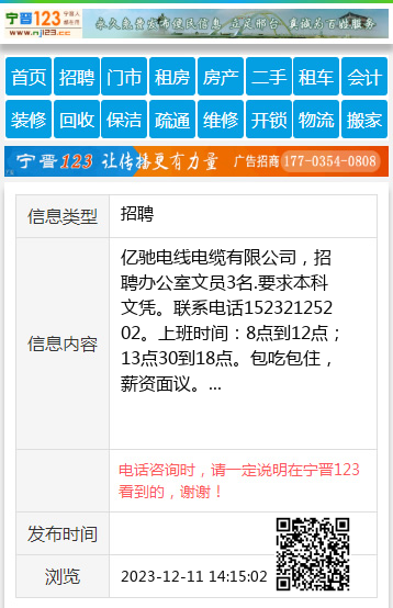 亿驰电线电缆有限公司,招聘办公室文员3名.要求本科文凭。联系电话15232125202。上班时间:8点到12点;13点30到18点。包吃包住,薪资面议。 【电话咨询时,请一定说明在宁晋123看到的,谢谢!】 |