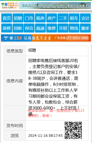 招聘家电售后接线客服20名,主要负责登记客户的安装/维修/以及咨询工作,要求18-38周岁,会讲普通话,简单电脑操作,8小时排班制,有晚班补助以上工作新人学习期间都会设保底工资,有专人带,包教包会,综合薪资3000-6000+,上不封顶!福利待遇:业绩红包+业绩奖品+绩效奖金 +过节福利+日常福利(水果,零食供应) 工作环境好,人事关系简单,欢迎踊跃报名。