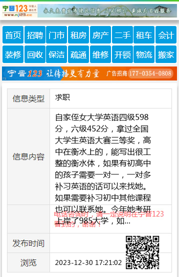 自家侄女大学英语四级598分,六级452分,拿过全国大学生英语大赛三等奖,高中在衡水上的,能写出很工整的衡水体,如果有初高中的孩子需要一对一,一对多补习英语的话可以来找她。如果需要补习初中其他课程也可以联系她。今年她考研上岸了985大学,如果有大学生的需要考研咨询的话她也可以提供一点帮助,有意愿的可以联系我侄女17302215118 【电话咨询时,请一定说明在宁晋123看到的,谢谢!】 |