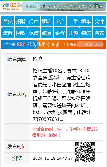 招聘主播10名,要求18-40岁普通话流利,有主播经验者优先,小白应届毕业生均可,带薪培训,底薪5000+提成工作稳定可以接受白晚班,需要接送孩子的勿扰,地址:方大科技园西,电话:17370997631 【电话咨询时,请一定说明在宁晋123看到的,谢谢!】 |
