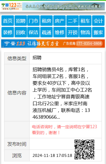 招聘销售员4名,库管1名,车间组装工2名,客服1名,要求女40岁以下,高中及以上学历,车间加工中心工2名,工作地址宁晋县青银高速口北行2公里,米家庄村南液压机械厂,联系电话:13463890666 【电话咨询时,请一定说明在宁晋123看到的,谢谢!】 |
